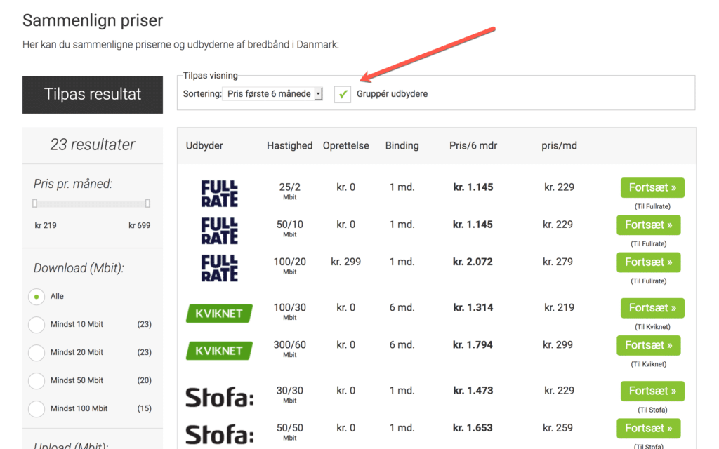 Derudover er der mulighed for gruppere alle udbyderne således at man får en overskuelig oversigt hvad de enkelte internetudbydere tilbyder. Funktionen til gruppering af udbyderne er markeret med en rød pil nedenfor.